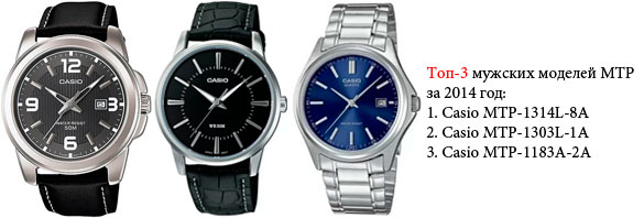 1. Casio MTP-1314L-8А - прибор снабжен мощным корпусом с черным циферблатом. Ирокий кожаный ремешок также в черном цвете. Аналоговый циферблат с окошком для текущего числа и с основными цифрами, отображающими время, 3.